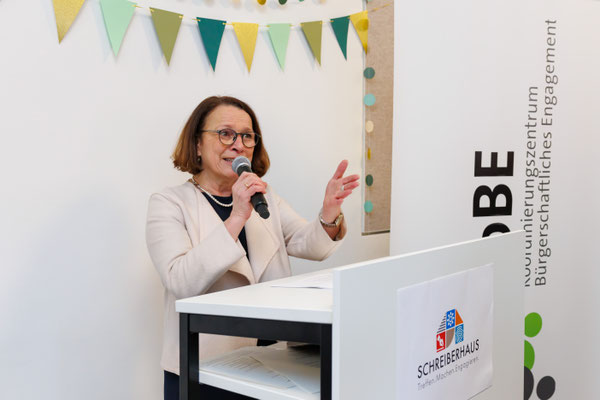 Feierliche Eröffnung u. a. mit der symbolischen Überreichung eines Transponders, der in Zukunft die Türen zum Schreiberhaus öffnen wird, von OB Maltz-Schwarzfischer an die Schreiberhauskoordinatorin v. Schelling
