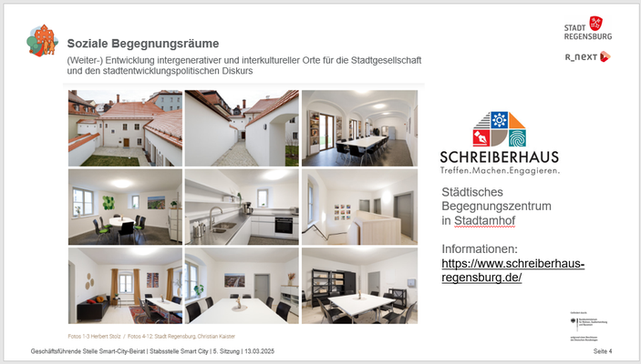 Smart City und das Projekt REGENSBURG_NEXT haben zum Ziel, die Stadt durch den Einsatz moderner Technologien und innovativer Lösungen nachhaltiger, lebenswerter und effizienter zu gestalten. Das Schreiberhaus selbst, betrieben durch die St. Katharinenspitalstiftung als freiem Träger und konzipiert von KoBE, stellt dabei ein Smart-City-Projekt dar, das unter den Bereich Soziale Begegnungsräume fällt und der (Weiter-) Entwicklung intergenerativer und interkultureller Orte für die Stadtgesellschaft und den stadtentwicklungspolitischen Diskurs dient. Hiermit gibt es einen weiteren Ort in der Smart City Regensburg für Gemeinschaft, Austausch und Zukunftsgestaltung haben. Das Schreiberhaus lädt dazu ein, aktiv zu werden, sich zu vernetzen und gemeinsam an Lösungen für die Herausforderungen unserer Zeit zu arbeiten.