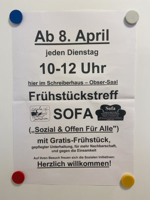 Das SOFA-Frühstück geht weiter: Jeden Dienstag von 10 bis 12 Uhr findet im Schreiberhaus der SOFA-Frühstückstreff statt.